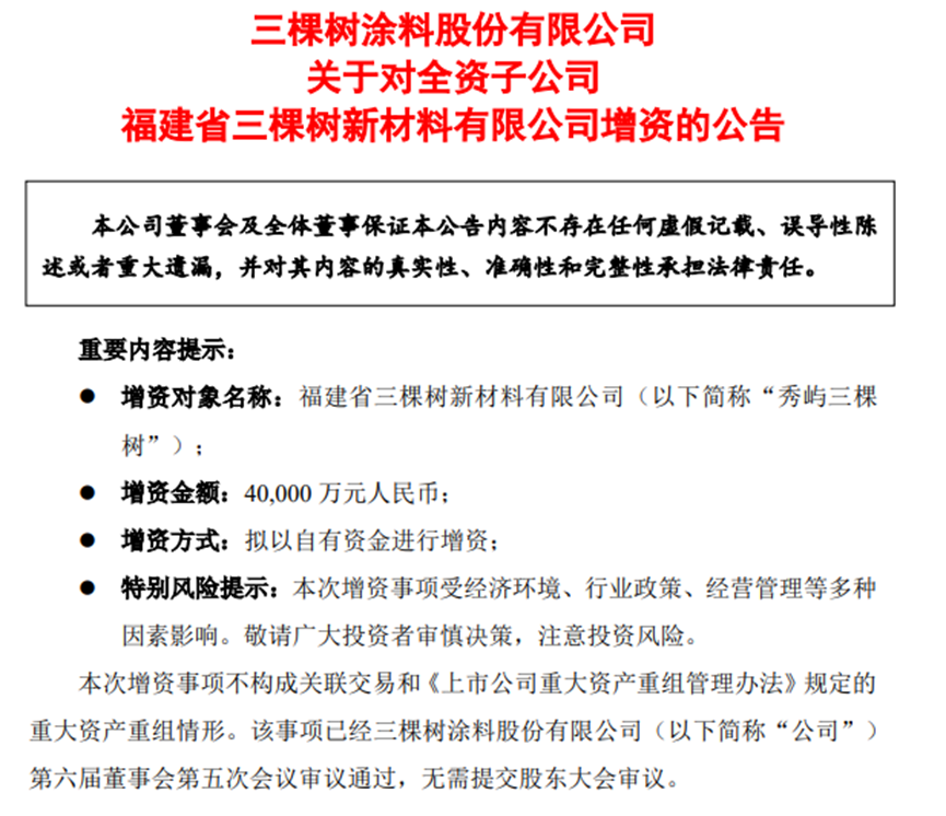 3月20日,三棵树(以下简称“公司”)发布公告称,拟以自有资金对公司全资子公司福建省三棵树新材料有限公司(以下简称“秀屿三棵树”)进行增资,增资金额为4亿元。增资完成后,秀屿三棵树由原注册资本7000万元增加至4.7亿元。