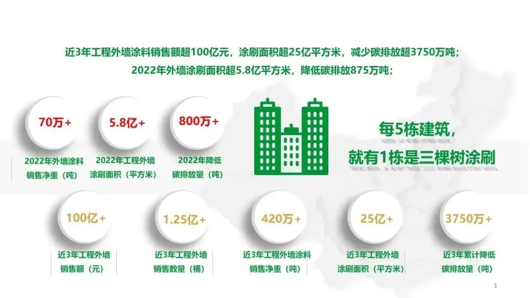近3年,三棵树工程外墙涂料销售额超100亿元,涂刷面积超25亿平方米,减少碳排放3750万吨。2022年工程外墙涂刷面积5.8亿平方米,也就是说,每5栋建筑就有1栋是三棵树涂刷的。