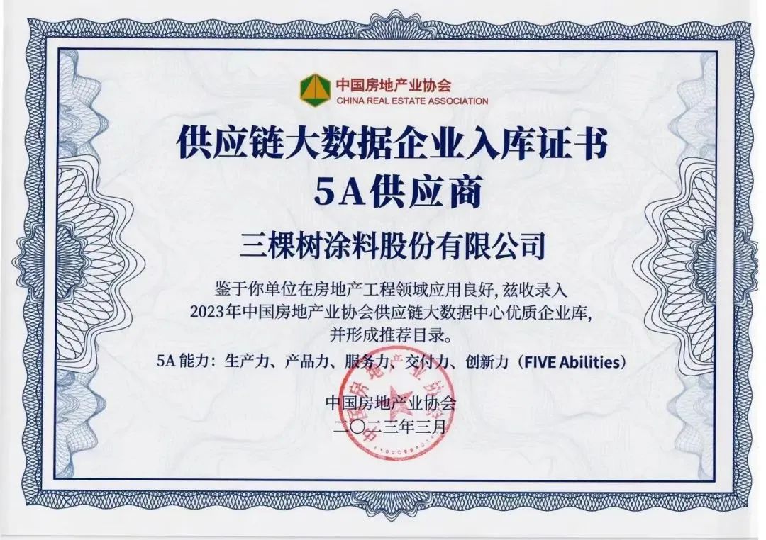 三棵树凭借强劲的品牌实力、绿色创新产品及优质服务口碑,实力入选“2023房建供应链综合实力TOP500强首选供应商”榜单,荣膺“工程外墙类民族品牌”、“多彩仿石类”、“真石质感涂料类”、“艺术涂料品牌”、“真石漆类”、“高端仿石漆(水性含多彩)”、“涂料装饰保温一体板(双包)类”七项榜单位列第一,同时在其他细分类榜单中入围并获得优异排名,成为建筑涂料行业中国民族品牌的领头羊。