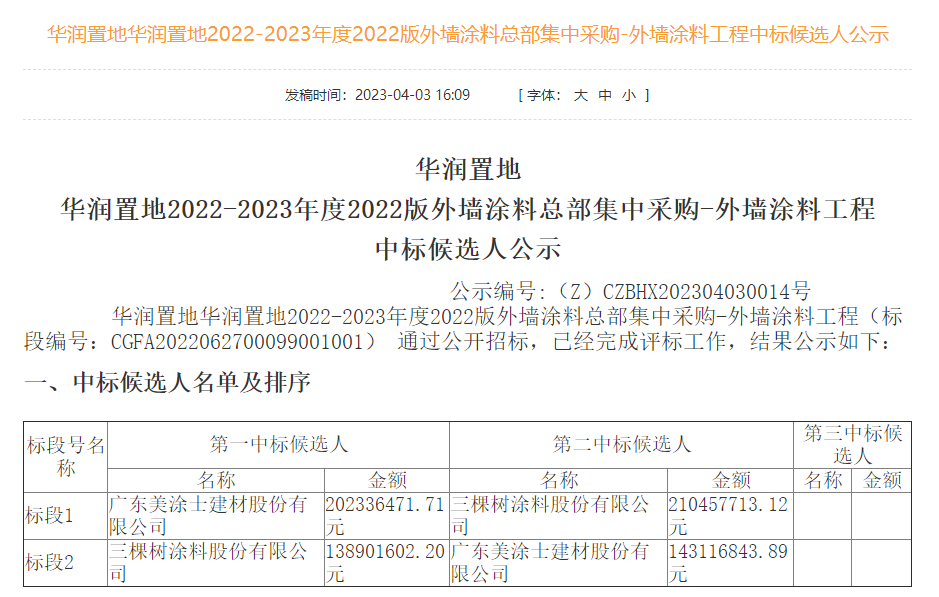 涂界记者4月4日获悉,通过公开招标,已经完成评标工作,华润置地控股有限公司于4月3日公示了华润置地华润置地2022-2023年度2022版外墙涂料总部集中采购-外墙涂料工程中标候选人结果。广东美涂士建材股份有限公司、三棵树涂料股份有限公司成功中标外墙涂料工程两个标段,合计中标金额高达6.948亿元。