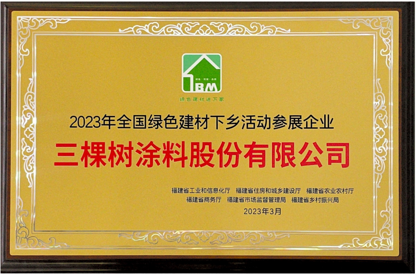 早在2022年绿色建材下乡活动启动伊始,活动会议公布了首批《2022年绿色建材下乡活动产品清单及企业名录》,三棵树内外墙涂料、地坪漆、小森板、防水涂料和防水卷材等多品类产品被优先列入该名单。本次启动会,三棵树新增水性平涂涂料荣获《绿色建材产品分级认证实施细则墙面涂料》三星级要求认证,再次验证了三棵树绿色产品的品质与理念始终走在行业的最前沿。