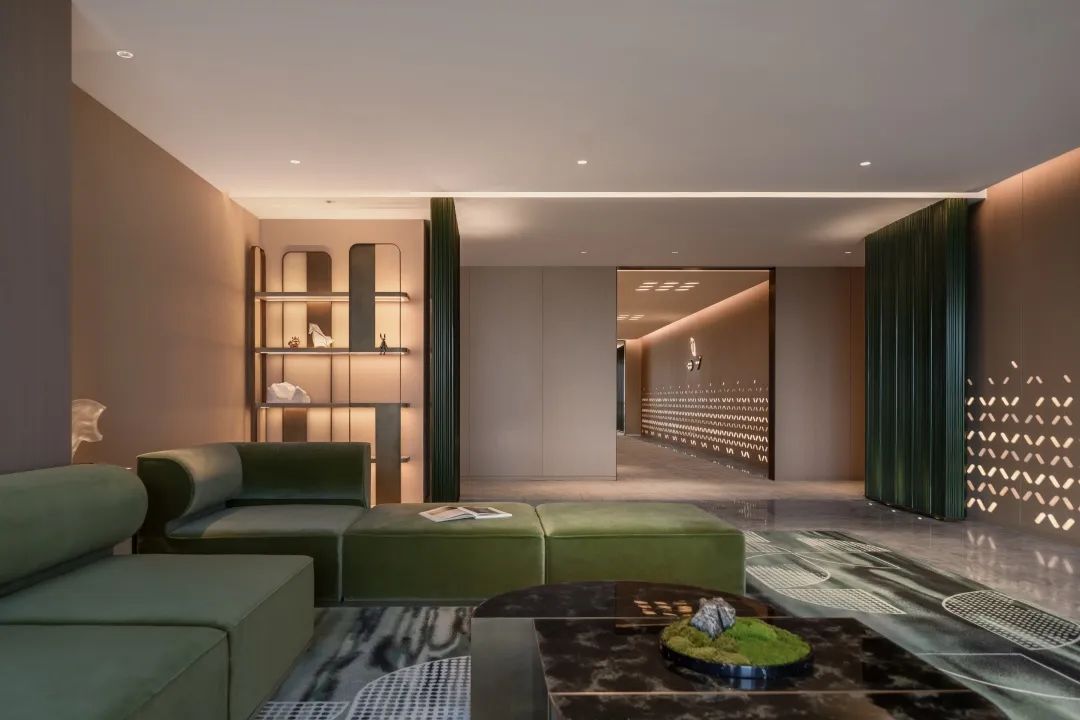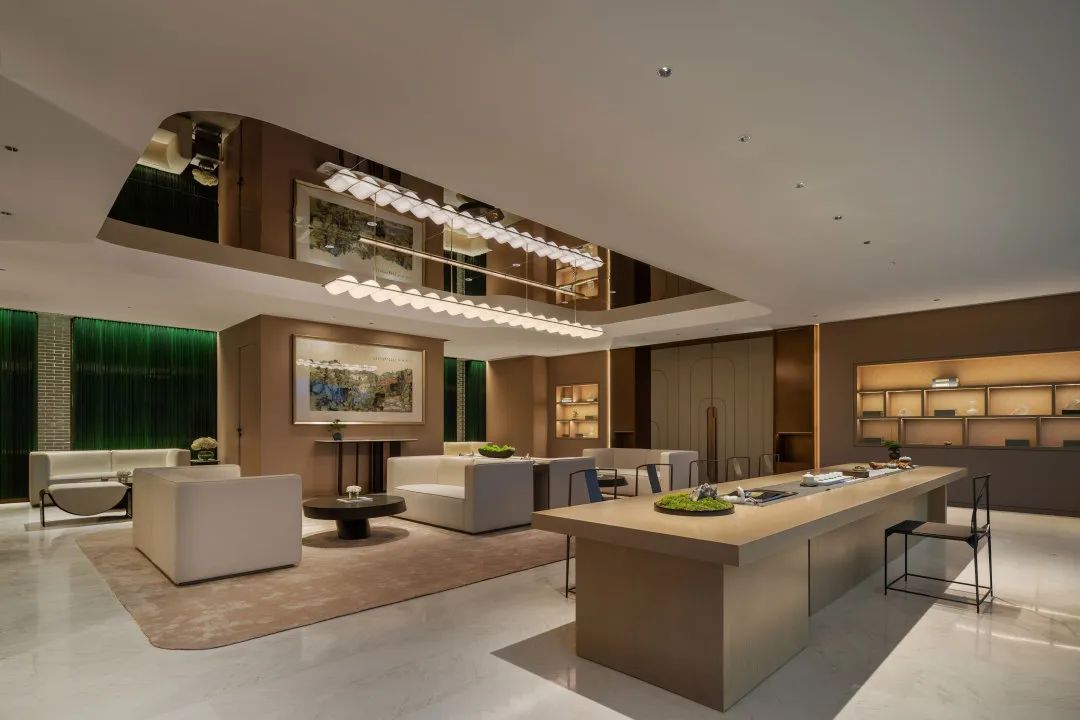 集现代大气为一体的空间设计中局部穿插符号化的中式元素,并将中式庭院概念引入公区室内设计中呼应内即是外,外即是内的道法精神,并暗含新与旧的交替与传承,将莆田的历史与三棵树的现在、未来呈现在使用者眼前。