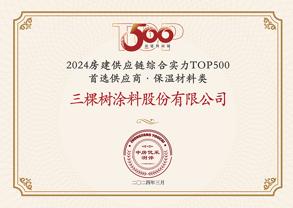 三棵树凭借领先的综合实力,以16%品牌首选指数跻身房建供应链企业综合实力TOP500-首选土建材料类品牌·保温材料类10强。