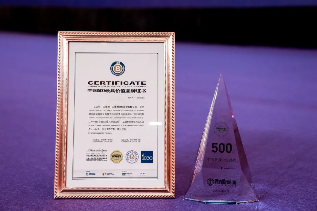 6月19日,由世界品牌实验室(World Brand Lab)主办的第二十一届“世界品牌大会”在北京举行。会上发布了2024年《中国500最具价值品牌》分析报告,三棵树以501.98亿元的品牌价值,第18次荣登“中国500最具价值品牌排行榜”,持续蝉联涂料榜单第一名。
