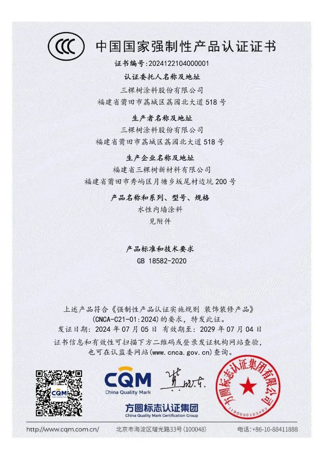 日前,三棵树通过“内墙水性涂料CCC认证”,认证证书编号001,该认证是对消费者安全的坚实守护,也是三棵树的健康性能再次赢得权威认可,更彰显三棵树作为民族涂料第一品牌的使命担当。