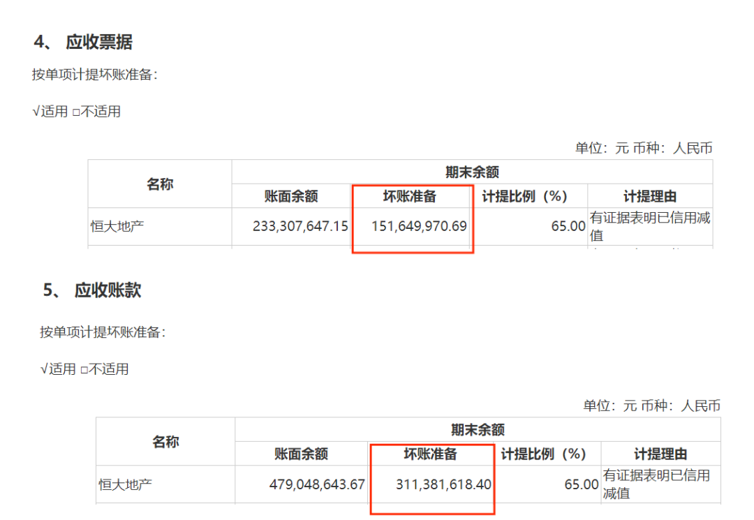 财报显示,2021年,三棵树对恒大地产应收票据计提了1.52亿元坏账准备、对应收账款计提了3.11亿元坏账准备;2022年,对恒大地产应收账款计提坏账准备达4.56亿元。