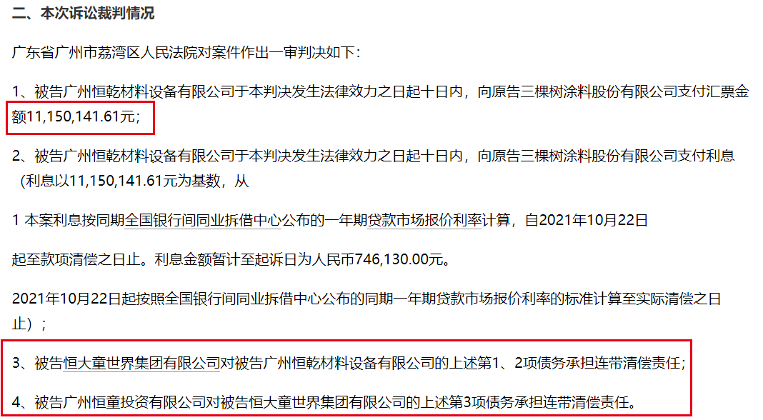 具体而言,法院判决恒乾材料于判决发生法律效力之日起十日内,向三棵树支付汇票金额1115.01万元以及相应利息。恒大童世界、恒童投资各自承担相应的连带清偿责任。