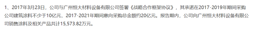 2017年3月,三棵树与恒大地产的间接全资子公司广州恒大材料设备有限公司签署协议,其承诺在2017-2019年期间采购公司建筑涂料不少于10亿元,2017-2021年期间意向采购总金额约20亿元。