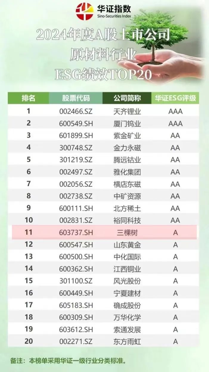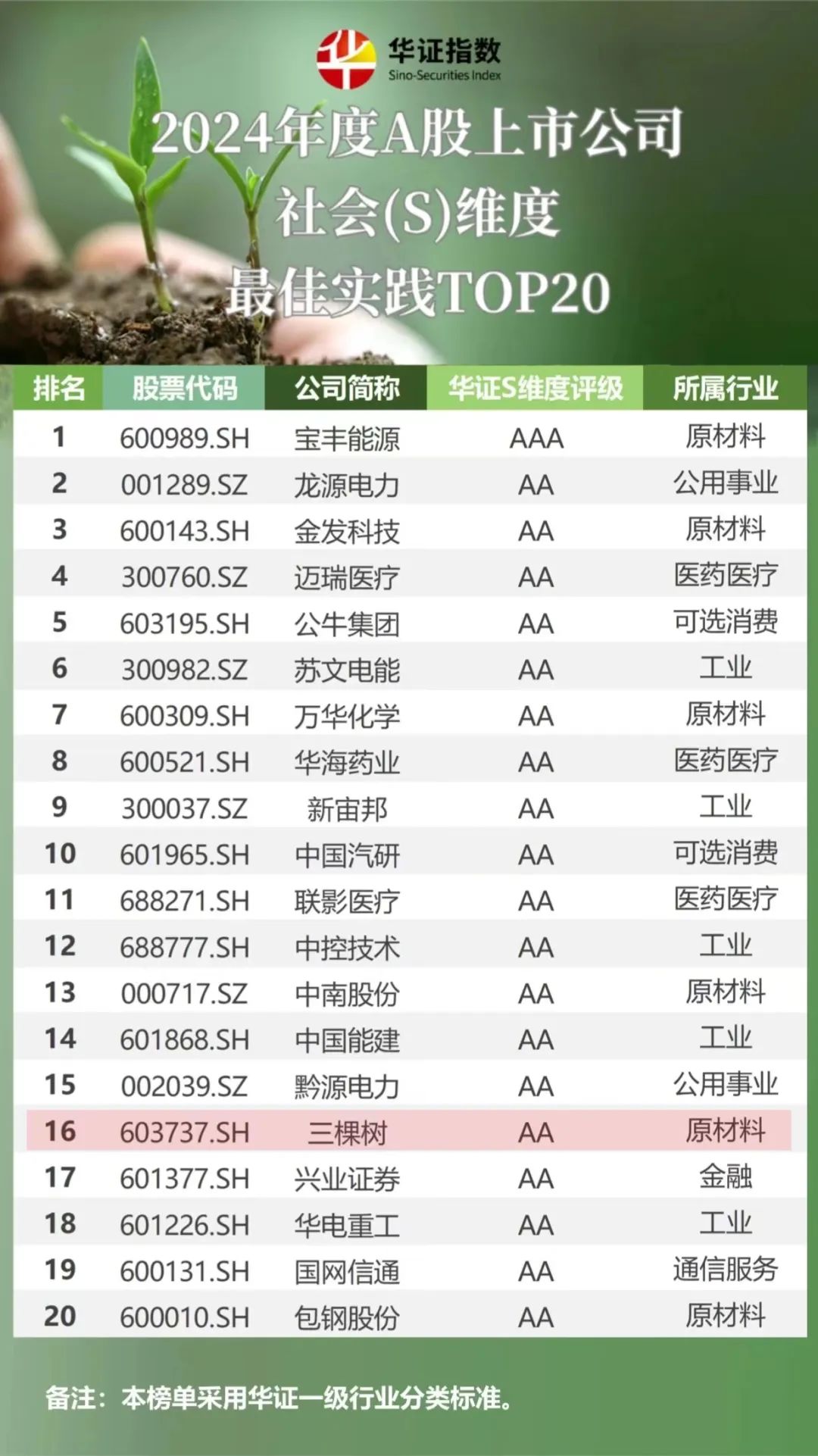 近日,上海华证指数信息服务有限公司(以下简称“华证”)正式更新了ESG评级数据,并发布了多项权威榜单。其中,三棵树凭借卓越的社会责任感和突出的可持续发展能力,荣获ESG评级A级,并成功跻身“2024年度A股上市公司原材料行业ESG绩效TOP20”榜单,同时荣登“2024年度A股上市公司社会(S)维度最佳实践TOP20”榜单。这一荣誉是对三棵树长期以来坚持可持续发展战略的肯定,也是对三棵树在社会责任领域所取得显著成就的认可。