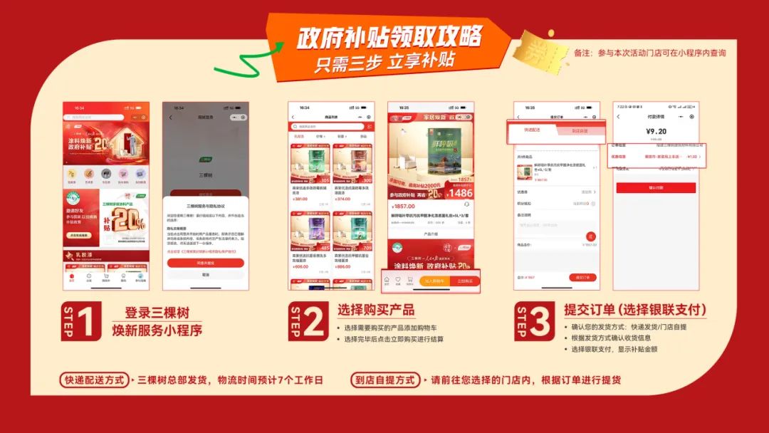 当前,“三棵树美好焕新”小程序已正式上线!足不出户,就能一键解锁多款环保涂料。消费者只需登录“三棵树美好焕新”小程序,选购心仪的产品,在完成支付时选择使用银联“云闪付”,便能立即享受到相应的补贴优惠,全方位满足您的家居焕新需求。