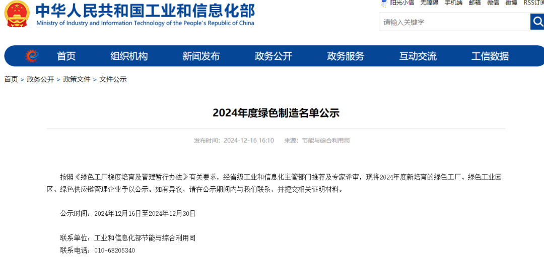 12月16日,工信部公示了2024年度新培育的绿色工厂、绿色工业园区、绿色供应链管理企业予以公示。