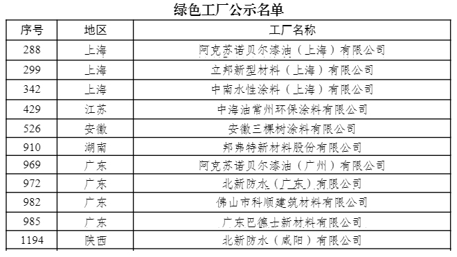 获得国家级绿色工厂的涂料、防水企业比较多,包括安徽三棵树涂料有限公司、阿克苏诺贝尔漆油(上海)有限公司、立邦新型材料(上海)有限公司、广东巴德士新材料有限公司、中南水性涂料(上海)有限公司、中海油常州环保涂料有限公司、邦弗特新材料股份有限公司、阿克苏诺贝尔漆油(广州)有限公司、北新防水(广东)有限公司、佛山市科顺建筑材料有限公司、北新防水(威阳)有限公司。