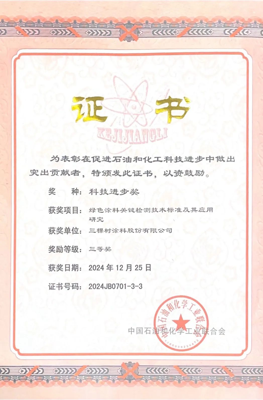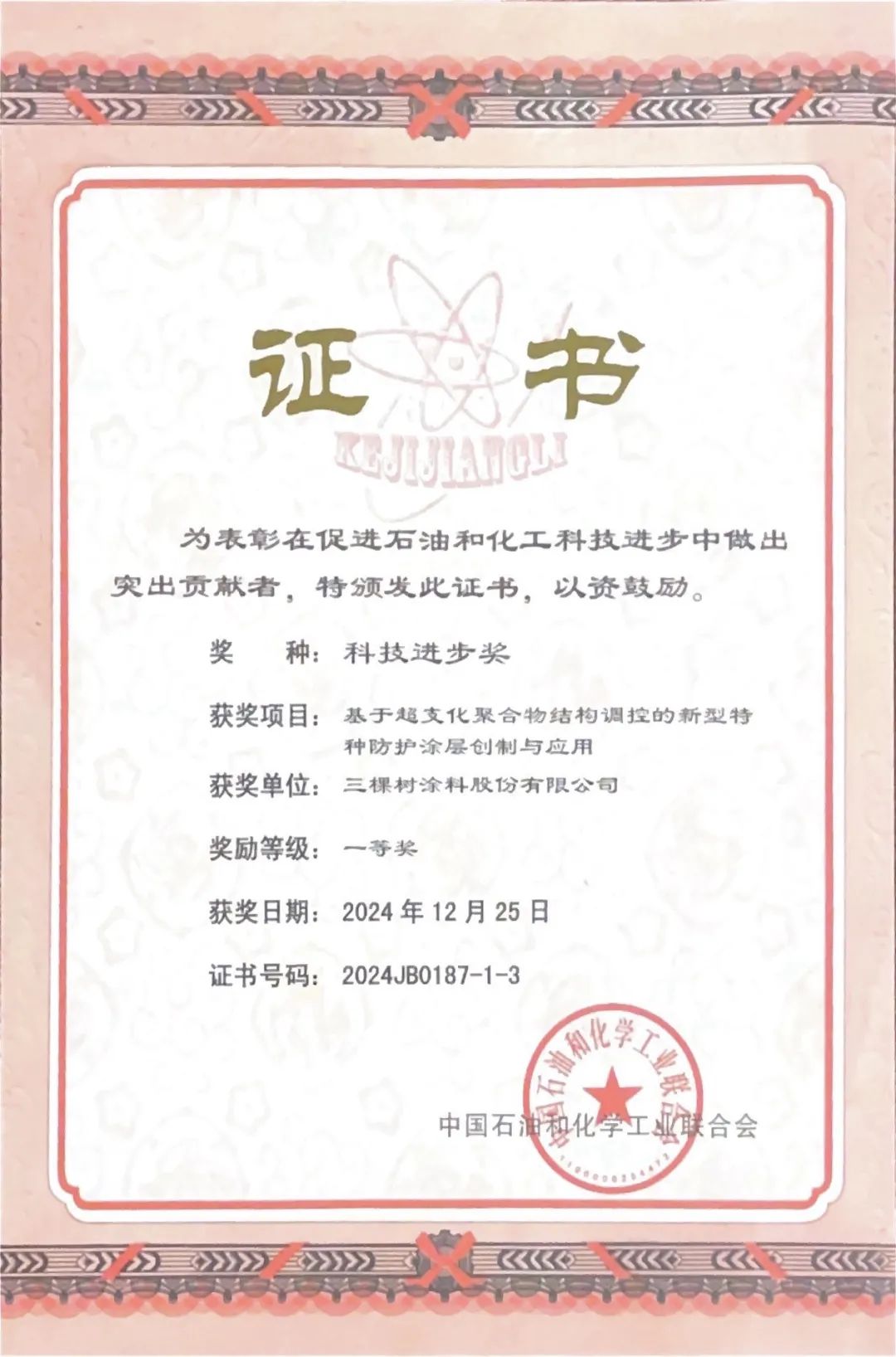 近日,中国石油和化学工业联合会“科技奖励大会”在北京隆重召开,三棵树再创佳绩,荣获两项科技进步大奖。三棵树与上海交通大学联合研发的“超支化聚合物型航天特种防护涂层关键技术开发与应用”获科技进步一等奖,与中海油常州涂料化工研究院联合进行的“绿色涂料关键检测技术标准及其应用研究”获科技进步三等奖,标志着三棵树在科技创新领域取得新的突破,以实际行动促进了高端工业涂料的国产化替代,进一步巩固了三棵树的行业领先地位。