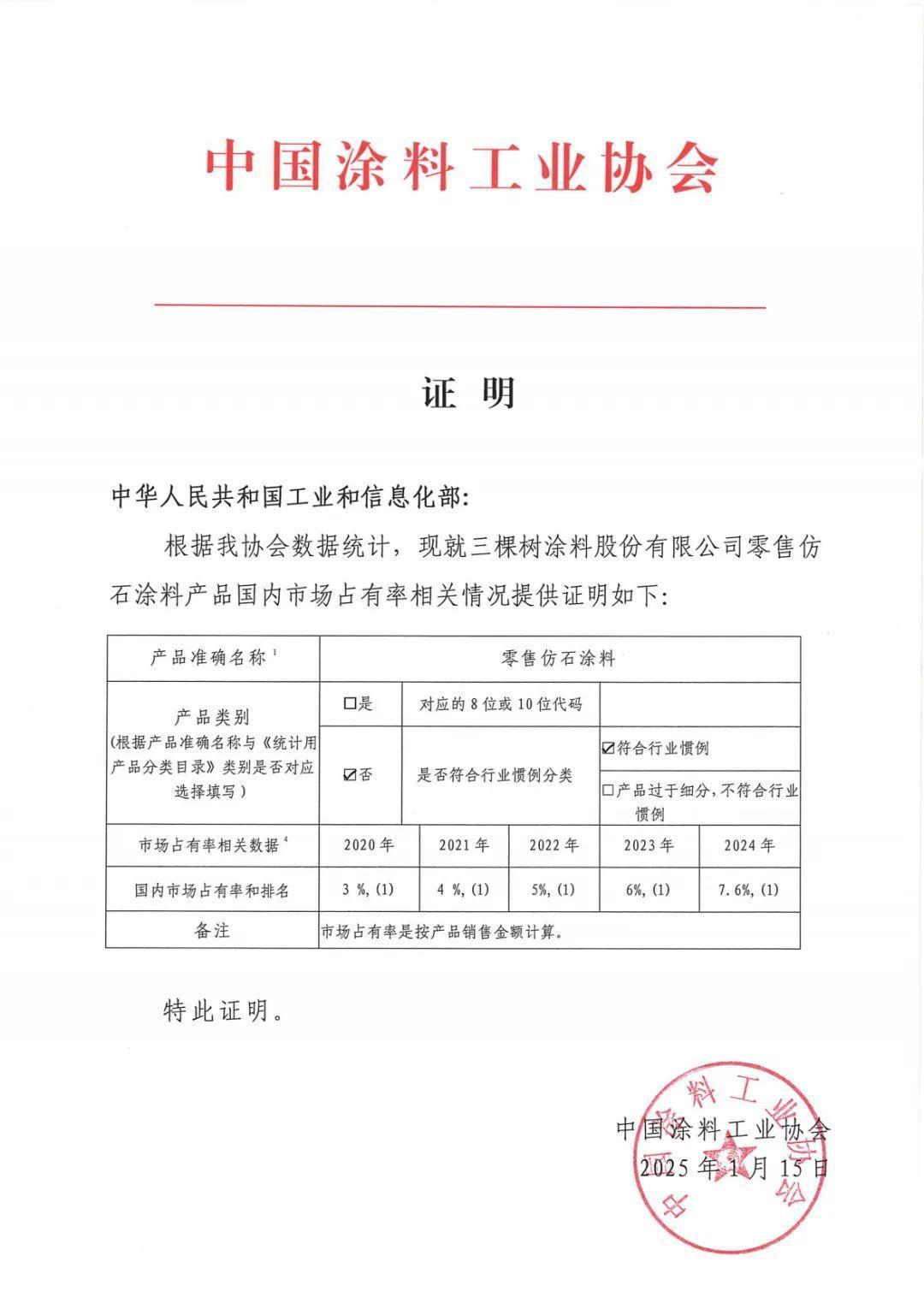 数据来源:中国涂料工业协会的数据显示,三棵树零售仿石涂料从2020年开始,连续五年成为市占率第一,于2025年1月15日完成证明。