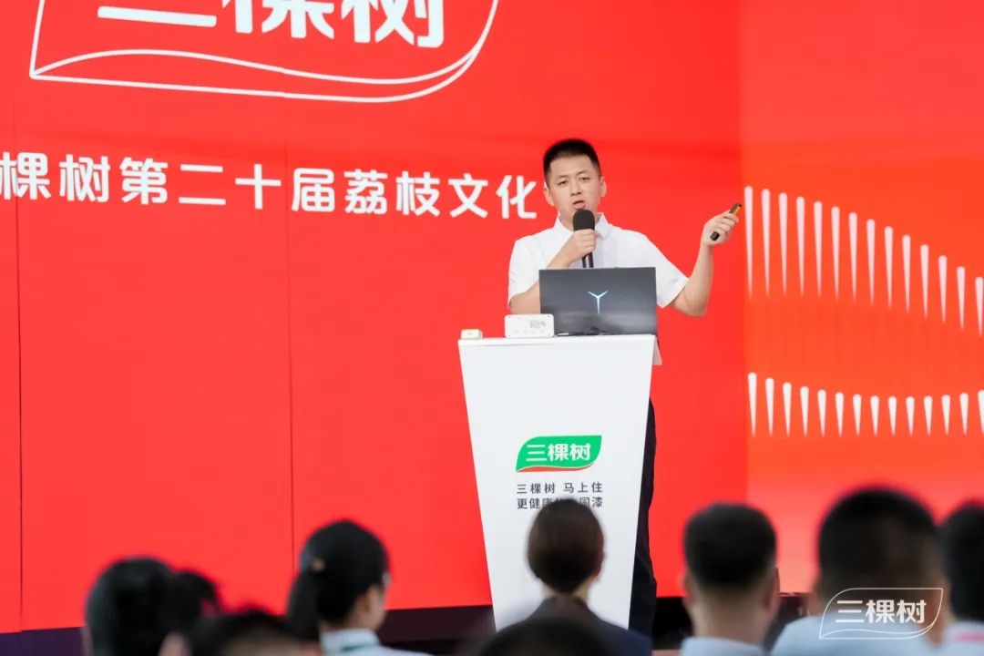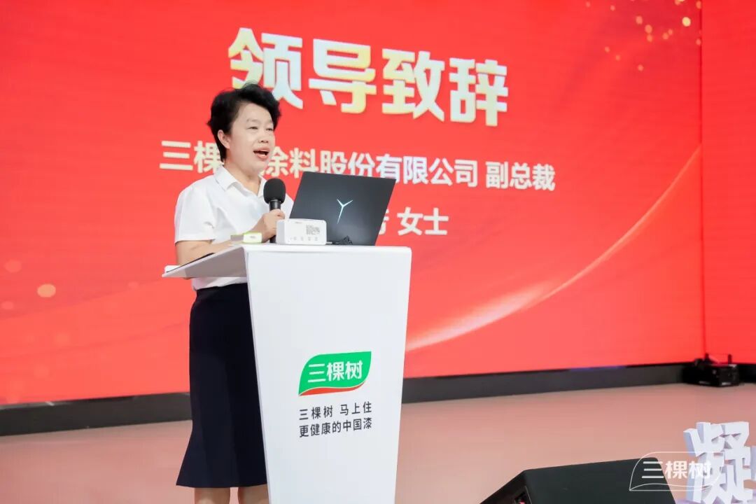 三棵树副总裁徐荔芳欢迎嘉宾们在荔枝文化节期间莅临三棵树醉美园区,她在致辞中强调,峰会旨在传承“永远向上”的企业精神,携手怀揣产业理想、深耕专业领域的伙伴,共同推动行业创新变革,“以相互成就孕育无限可能,方能绘就胶粘剂行业新图景。”
