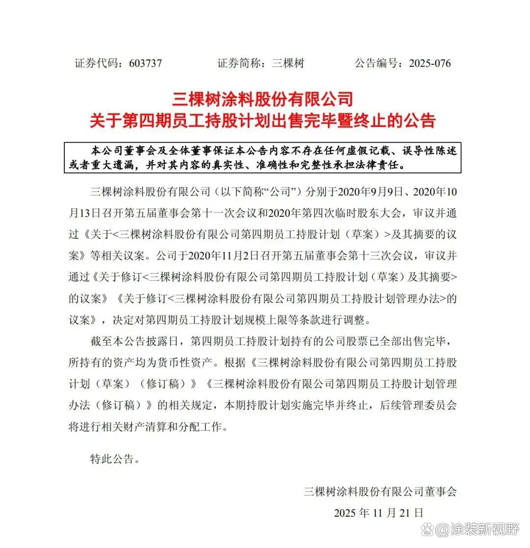 三棵树 第四期员工持股计划正式终止,所持公司股票全部出售完毕。