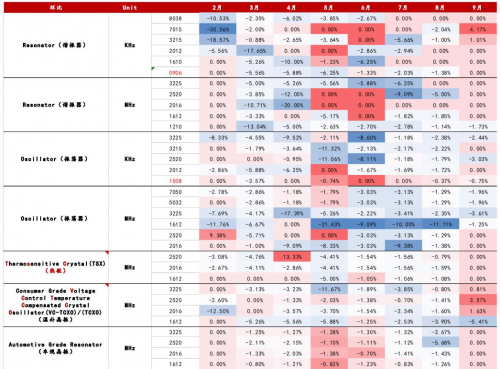 在大规模回购股份的同时,目前多种规格的晶振产品价格已止跌,甚至环比出现涨价趋势。如下图所示,2023年9月,共有18种规格的晶振产品价格环比止跌,共有4种规格的晶振产品价格环比上升。