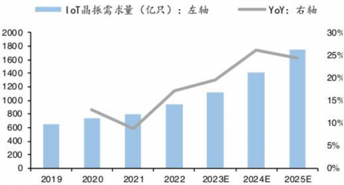 物联网应用场景丰富,预计2025年全球物联网终端连接数量为270亿台,AIoT终端晶振平均使用数量为3只,预计2025年全球AIoT晶振需求量将达到1750亿只左右,穿戴设备和智能家居为主要增长点。