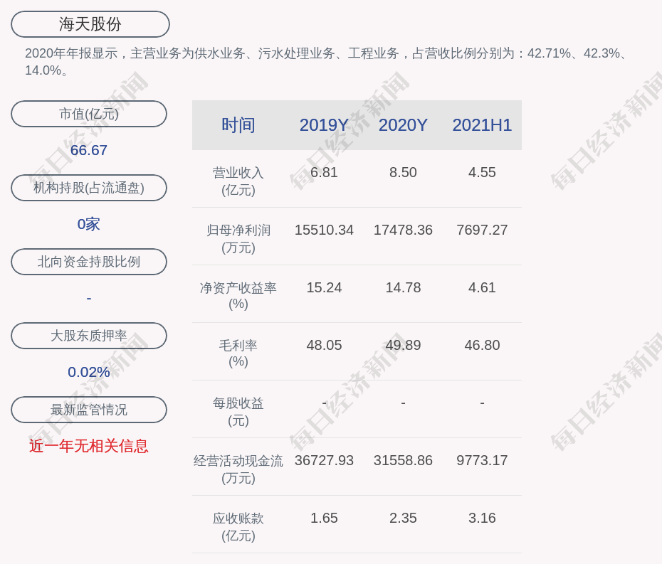 2020年年报显示,海天股份的主营业务为供水业务、污水处理业务、工程业务,占营收比例分别为:42.71%、42.3%、14.0%。