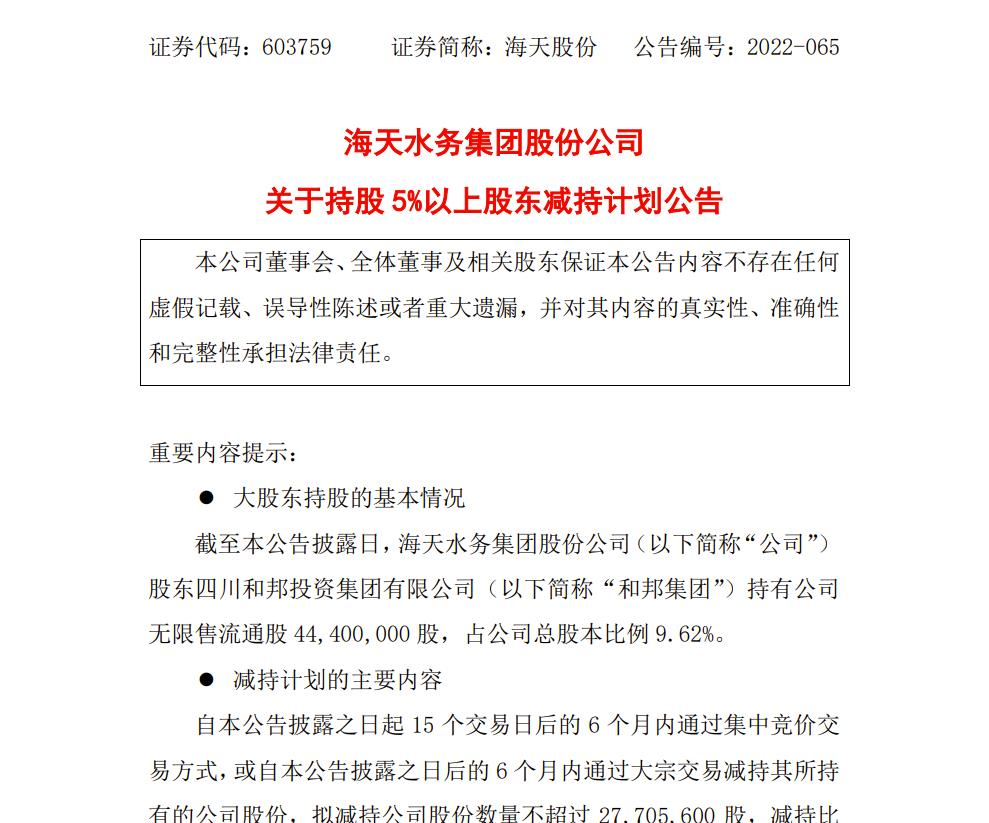 截至本公告披露日,海天水务集团股份公司股东四川和邦投资集团有限公司持有公司无限售流通股4440万股,占公司总股本比例为9.62%。拟减持原因为股东自身资金需求。