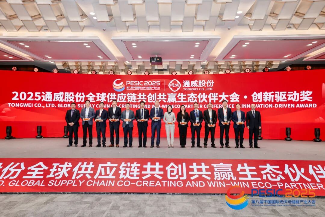 11月17日,2025第八届中国国际光伏与储能产业大会期间,通威股份全球供应链共创共赢生态伙伴大会等系列会议在成都通威国际中心举行。海天股份旗下海天光伏斩获“创新驱动奖”与“同舟共济”两项重磅荣誉,海天股份总裁、海天新材料执行董事费俊杰,海天股份副总裁、光伏事业部负责人高昌禄出席会议并代表领奖,见证荣誉时刻。