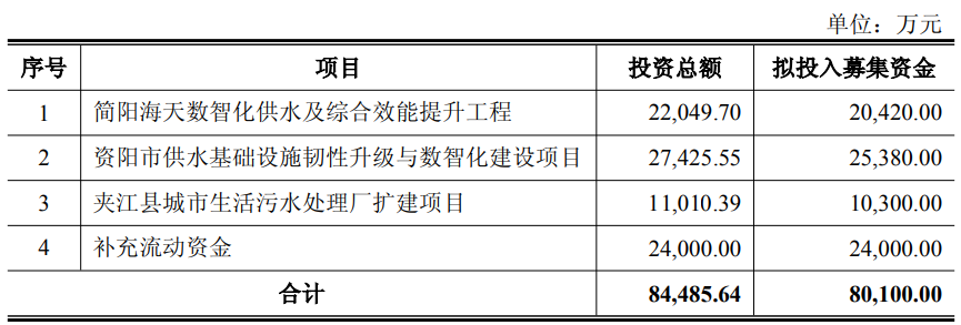 海天股份 2025年12月2日披露向不特定对象发行可转换公司债券证券募集说明书(申报稿),公司本次拟发行可转换公司债券的募集资金总额不超过80,100.00万元(含本数),扣除发行费用后拟用于简阳海天数智化供水及综合效能提升工程、资阳市供水基础设施韧性升级与数智化建设项目、夹江县城市生活污水处理厂扩建项目、补充流动资金。