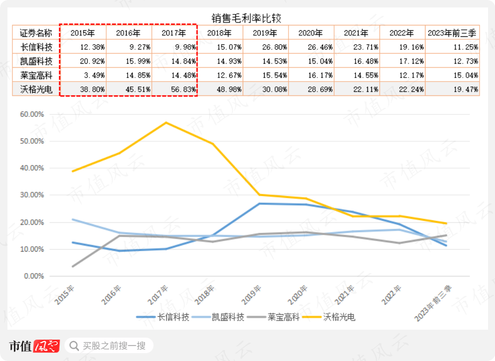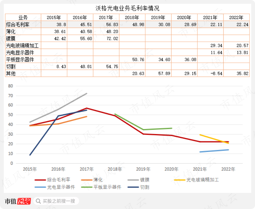 从综合毛利率看,沃格光电的毛利率逐年下降,2022年降至22.2%。