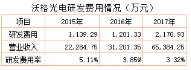 上市前的2015年至2017年,沃格光电的研发费用率分别为5.1%、3.9%、3.3%;再结合核心技术人员的从业背景看,该公司的技术含量似乎并不高;而低研发费用率、高毛利率(远高于同行)的情况极其诡异,财务造假的可能性极高。