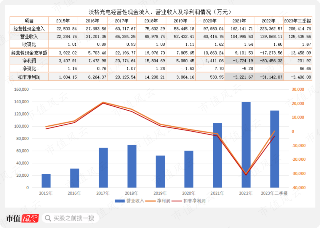 沃格光电业绩有个非常典型规律,即上市前业绩逐年增长,从2015年扣非净利润1804万元快速增长至2017年的2.01亿元,仅隔两年业绩增长了10倍,非常诡异的增长;而在上交所上市后,业绩则是逐年下降,并且下降幅度非常快,从2018年扣非净利润1.4亿元到2022年亏损3.1亿元,中间仅仅相隔3年。