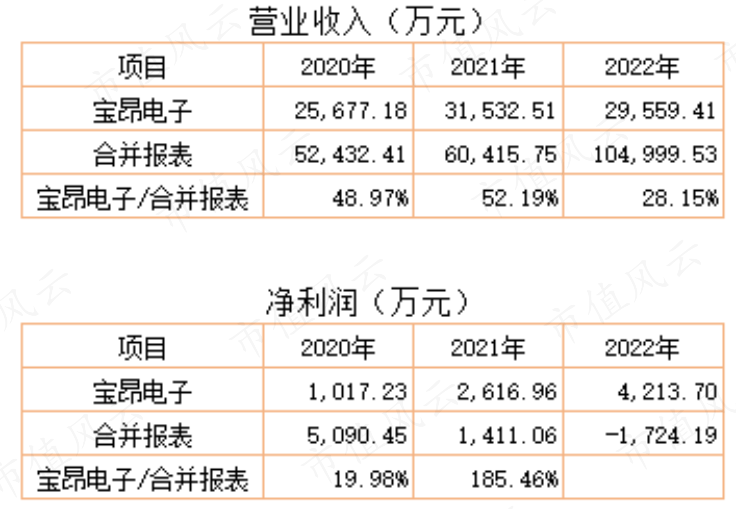 需要指出的是,宝昂电子交易对方承诺其2021年、2022年扣非净利润分别不低于2500万元、4000万元,实际实现2603.41万元、4213.70万元,2022年的扣非净利润同比增长61.85%且均是踩线完成业绩承诺;而同期宝昂电子分别实现营业收入3.15亿元、2.96亿元,同比减少6%。