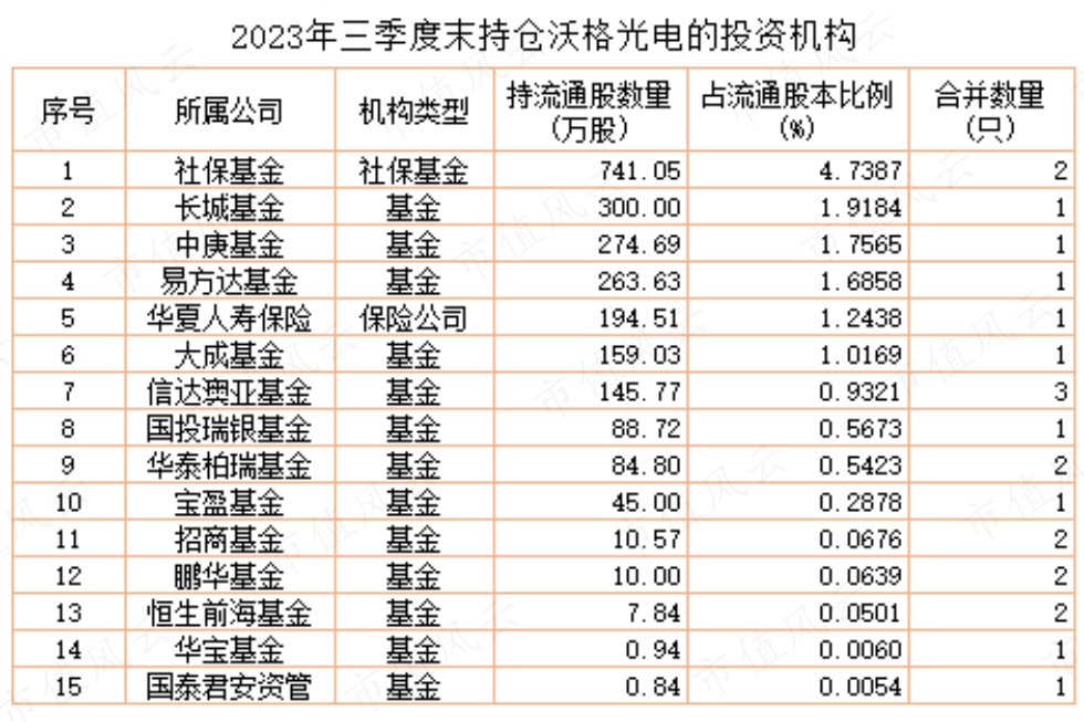 其中,2只社保基金合计持仓741万股,长城基金、中庚基金、易方达基金分别持仓300万股、275万股、264万股。持仓沃格光电的投资机构比较分散,暂时没有出现一家独大的情况。