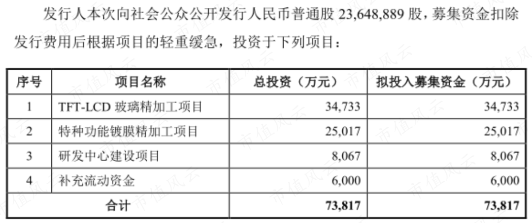 根据招股说明书披露,募投的“TFT-LCD玻璃精加工”项目建成后新增年加工TFT-LCD玻璃薄化120万片,镀膜220万片,黄光蚀刻120万片。