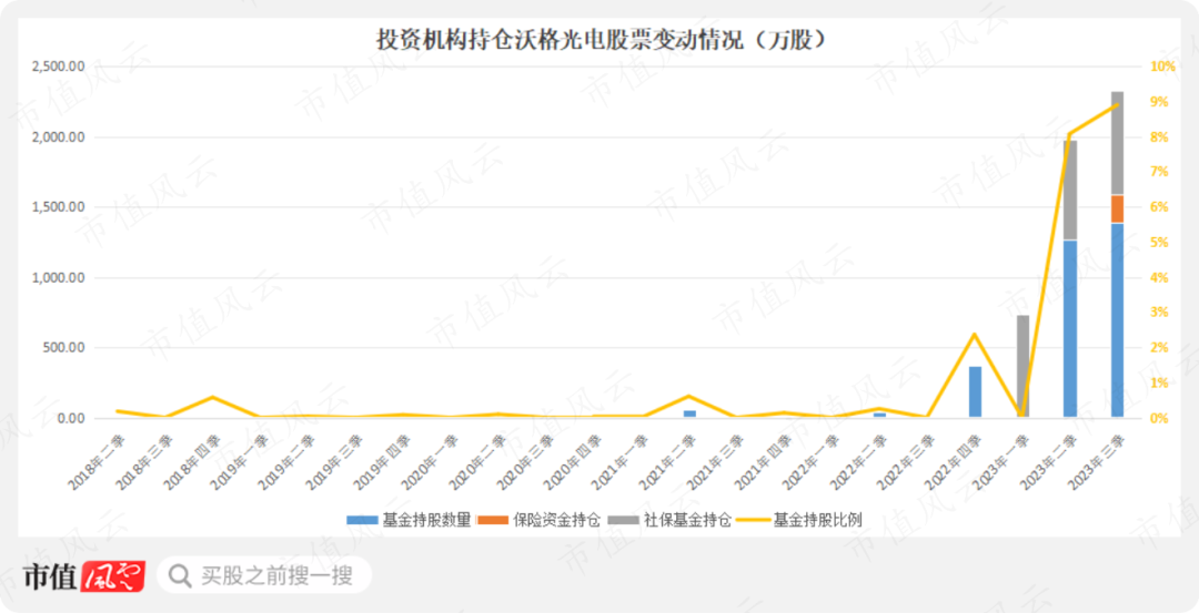 公募基金、社保基金等投资机构从2022年四季度开始买入沃格光电股票,并一路加仓,截止2023年三季度末,几大投资机构合计持有沃格光电股票至少2350万股(三季度披露的持仓数比真实持仓数少)。