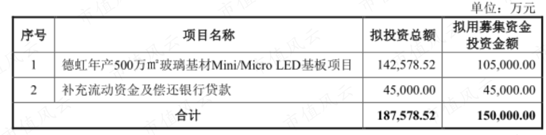 2023年7月,该公司再次发布定增方案,拟采用采取竞价发行方式,发行不超过5135.5万股(含本数)募集不超过15亿元,其中,10.5亿元用于年产500万㎡玻璃基材Mini/MicroLED基板项目,余下资金补充流动资金及偿还银行贷款。
