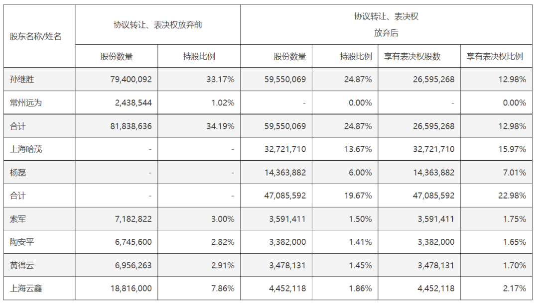 经各方协商一致,这部分股份转让价格为每股13.76元。其中,公司控股股东、实际控制人孙继胜向上海哈茂转让其持有比例为8.29%的1985万股,股份转让价款达2.73亿元,转让后持股比例下降至24.87%。常州远为转让其持有比例为1.02%的243.85万股,股份转让价款为3355.44万元,转让后不再持有公司股份。此外,索军转让其持有比例为1.5%的359.14万股,陶安平转让其持有比例为1.41%的336.36万股,黄得云转让其持有比例为1.45%的347.81万股,持股比例均下降一半,股份转让价款分别为4941.78万元、4628.31万元、4785.91万元。3月14日,上海哈茂已与上述股东签署《股份转让协议(一)》。