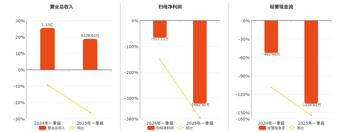 公司营业总收入为8339.92万元,较去年同报告期营业总收入减少2967.77万元,同比较去年同期下降26.25%。归母净利润为-2462.50万元,较去年同报告期归母净利润减少1945.39万元。经营活动现金净流入为-1228.02万元,较去年同报告期经营活动现金净流入减少745.42万元。