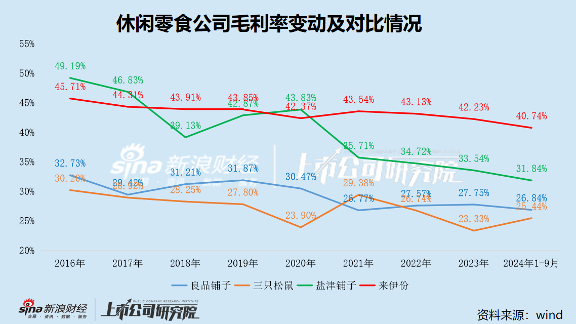 2024年1-9月,来伊份实现营业收入25.23亿元,较上年同期下滑15.96%;盐津铺子、三只松鼠的营业收入分别同比增长28.49%和56.46%;良品铺子的营业收入虽也下滑,但降幅仅是公司的一半左右,营收规模仍是公司的两倍。