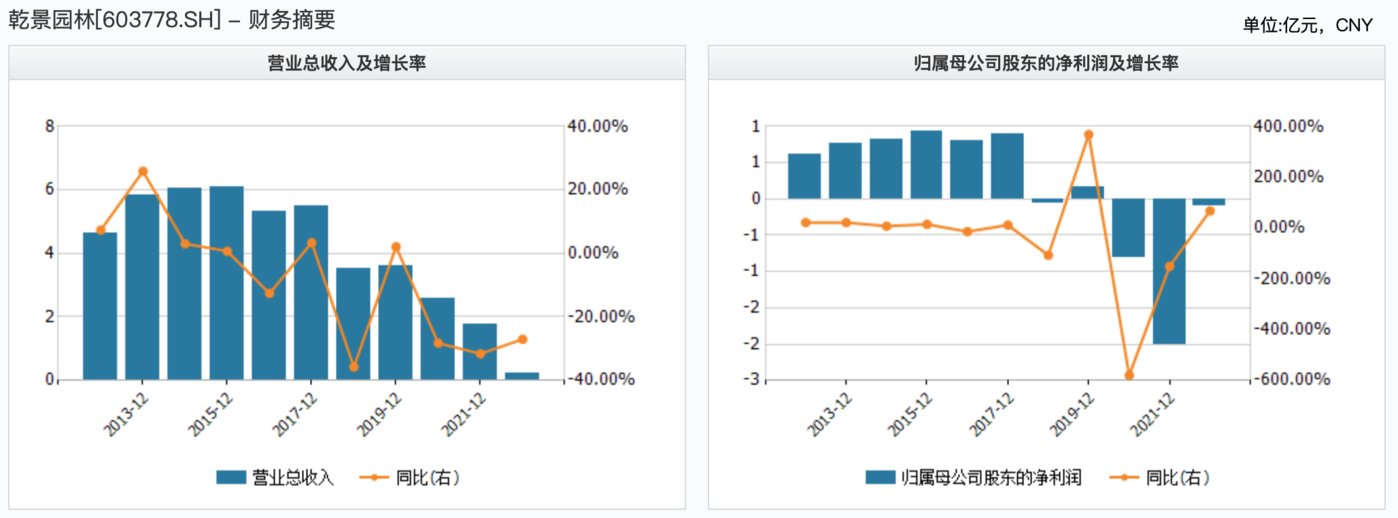 乾景园林成立于2002年,主营业务为园林工程施工、园林景观设计以及苗木种植与养护,2015年12月于上交所上市。但上市即巅峰,公司自上市后营收和利润就进入了下行通道,业绩一年不如一年。其营收规模已从2015年的6.08亿元降至2021年的1.77亿元,净利润更是连续两年亏损,2021年实现归母净利润-2.01亿元。