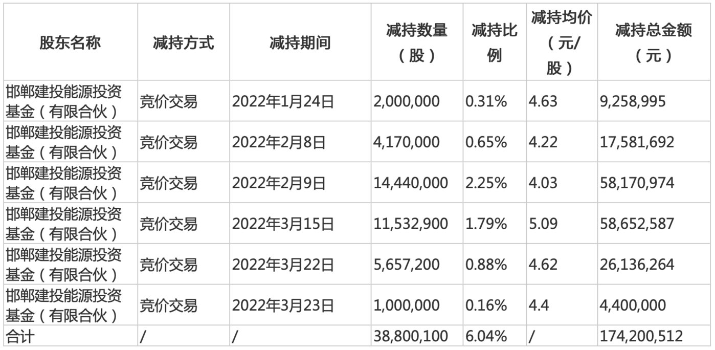 其中邯郸建投能源基金自2022年1月24日至2022年3月23日期间,通过集中竞价交易方式合计减持公司股份3880.01万股,减持完成后,邯郸建投的持股比例从年初的10.89%降至4.86%,套现总金额1.74亿元。