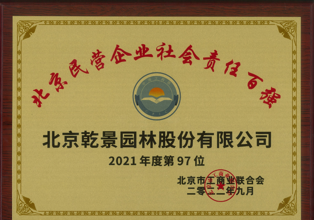 在9月26日北京市工商联召开的2022北京民营企业百强发布会上,北京乾景园林股份有限公司荣登2022北京民营企业社会责任百强榜。该榜单多维彰显了以社会责任百强为代表的北京民营企业勇担社会责任的时代风貌,号召广大民营企业关注民生福祉,服务国家战略。
