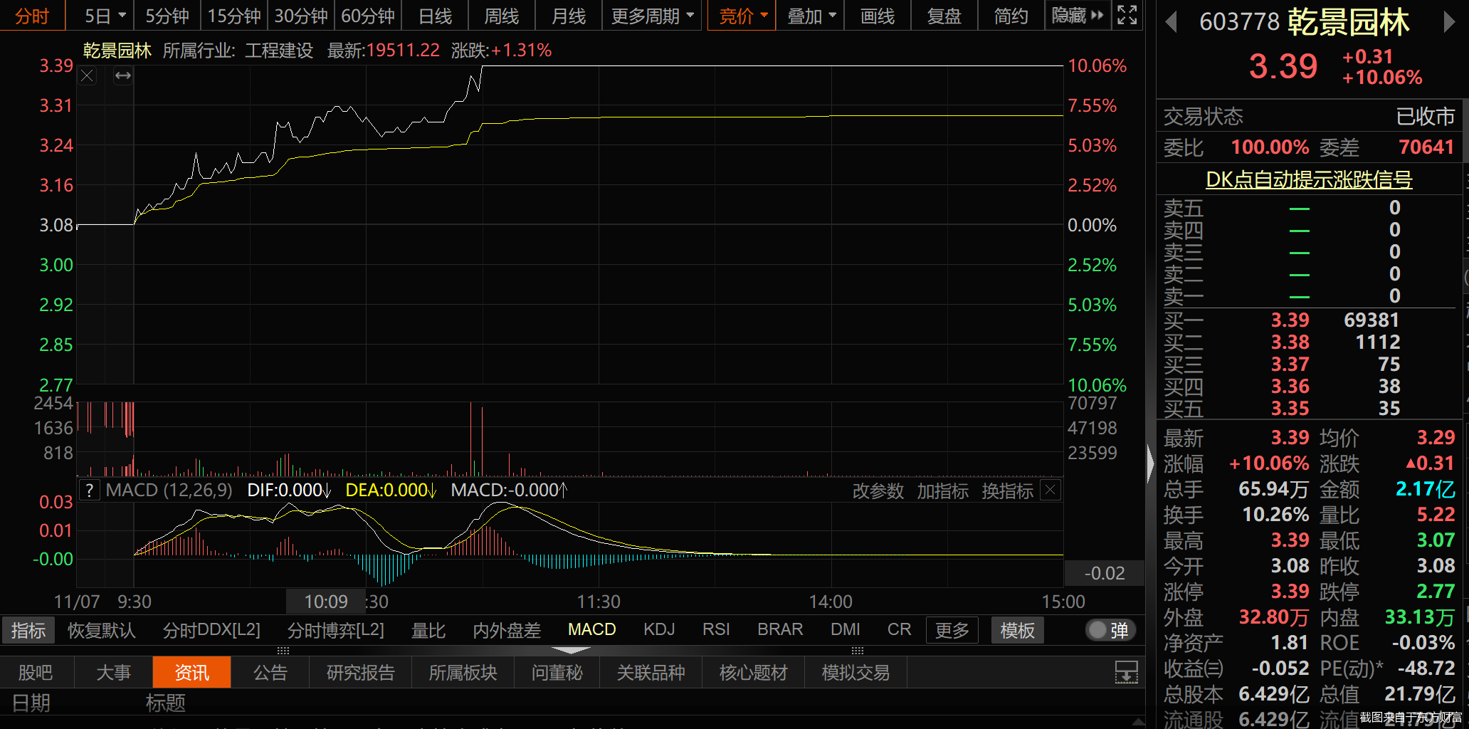 值得注意的是,11月7日,乾景园林股价提前涨停。交易行情显示,11月7日,乾景园林平开,开盘价为3.08元/股,盘中冲上涨停,最终以涨停收盘,收涨10.06%,收盘价为3.39元/股,总市值为21.79亿元,换手率为10.26%。