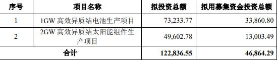 本次拟向特定对象发行股票募集资金总额不超过46864.29万元(含本数),扣除发行费用后募集资金净额将用于投资1GW高效异质结电池生产项目、2GW高效异质结太阳能组件生产项目。
