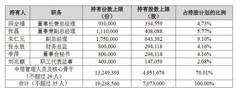 根据公司上周五披露的员工持股计划草案,此次员工持股计划参与对象中包括6名高级管理人员,拟认购份额占员工持股计划总份额的比例为 29.99%,接近1/3,其中公司实际控制人回全福认购份额上限不超过持股计划的 4.73%。