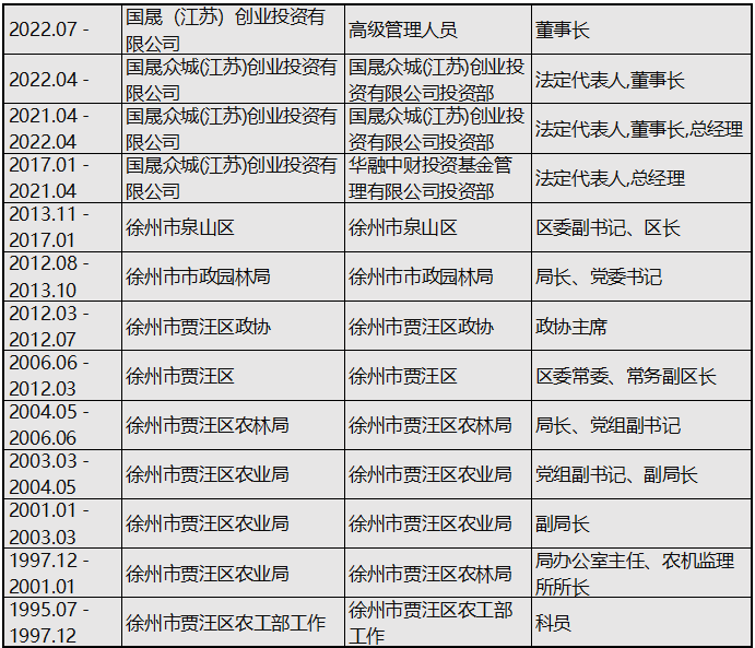 通过中国证券投资基金业协会的私募基金管理人公示信息,我们得以了解国晟众城(江苏)创业投资有限公司法人代表、董事长吴君的履历,如下: