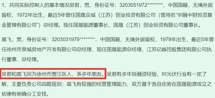 另据天眼查显示,从2009年至2015年,高飞在徐州市贾汪区区属国有企业——徐州市泉城房地产开发有限公司担任总经理。从时间上看,吴高两人除了“多年朋友”之外,当时在工作上或许亦有交集。进入“房住不炒”时代,高飞随朋友吴君,共同转换职业赛道,弃地产而投身光伏,亦在情理之中。