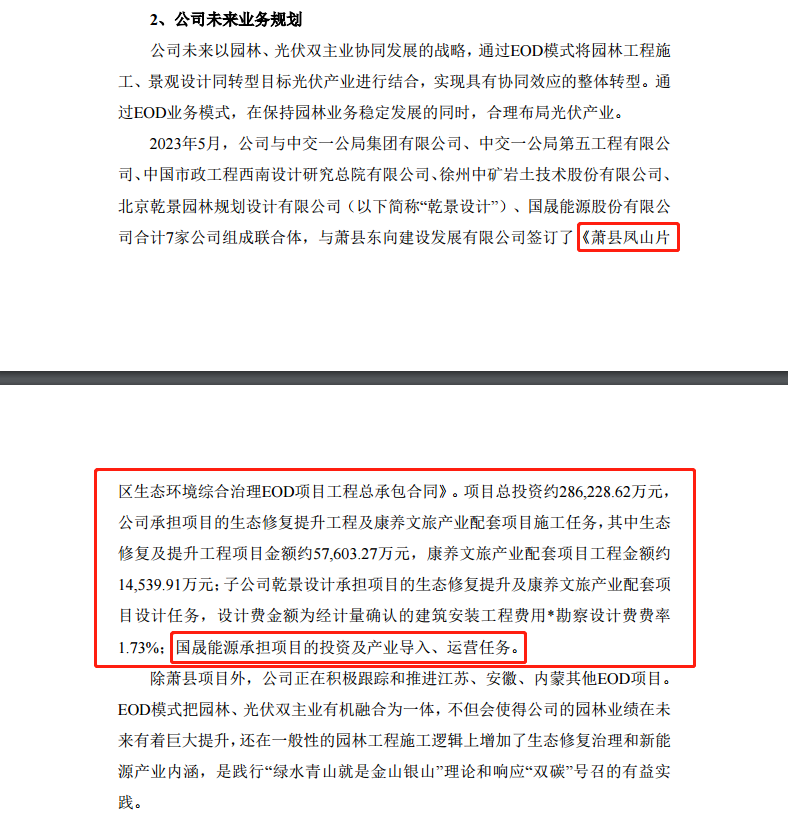 在公司回复上交所问询函中,乾景园林的表述为“通过EOD模式将园林工程施工、景观设计同转型目标光伏产业进行结合,实现具有协同效应的整体转型”。同时还举例了萧县凤山片区生态环境综合治理EOD项目,该项目投资总额为28.62亿元,在项目介绍中,诸多内容均是与乾景园林主业的园林设计与施工相关,而与光伏相关,或者与国晟能源相关的内容仅有简单的一句话——国晟能源承担项目的投资及产业导入、运营任务。