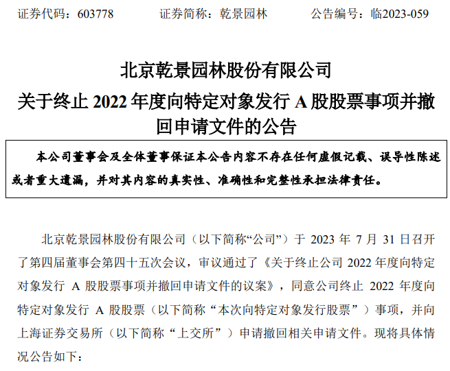 8月1日,乾景园林发布公告称,终止公司2022年度向特定对象发行A股股票事项并撤回申请文件的议案。