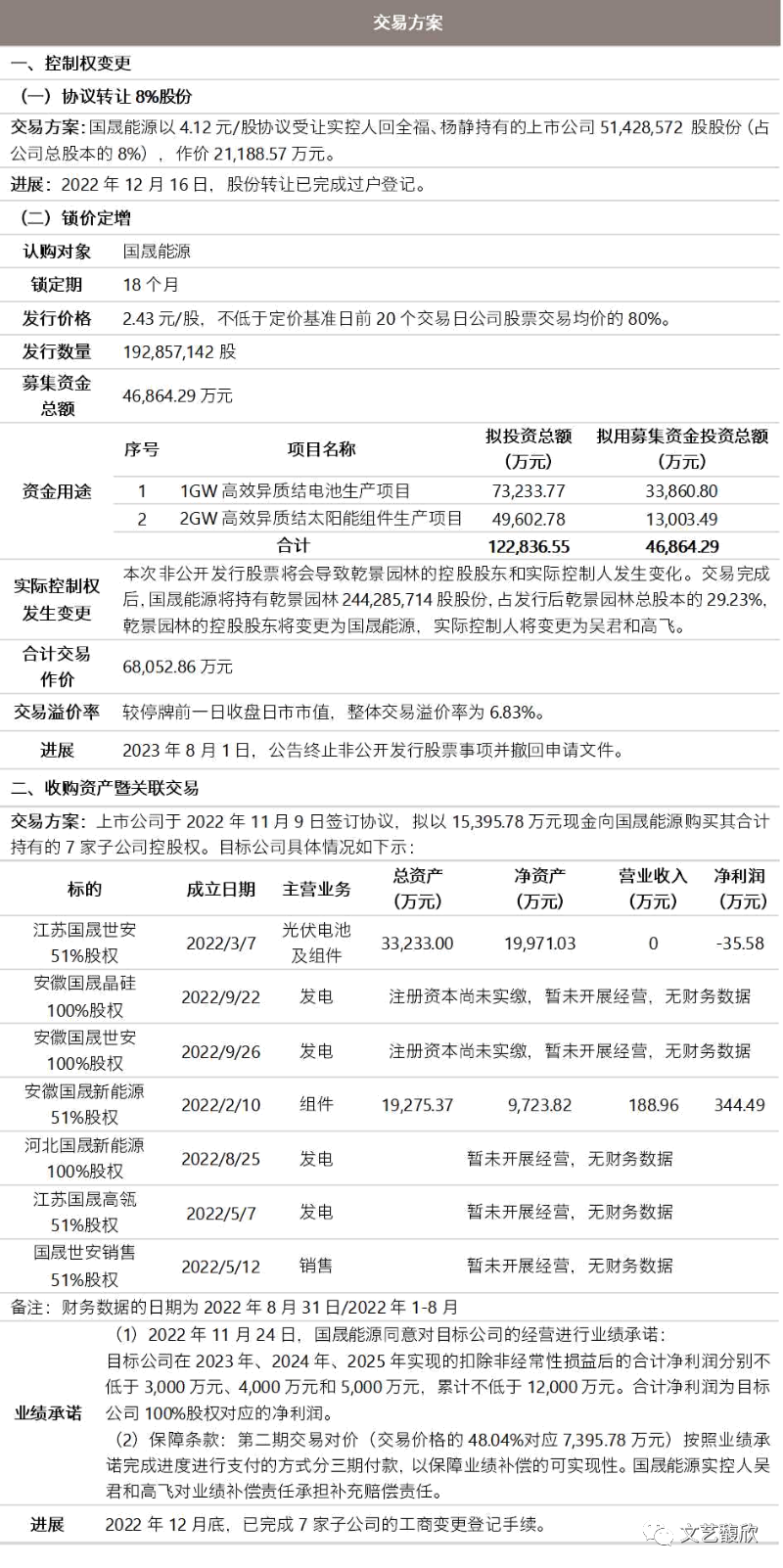 2023年8月1日,乾景园林(603788.SH)公告,鉴于资本市场及相关政策的变化,结合公司实际情况,公司决定终止向收购方锁价定增募集4.69亿元资金事项。乾景园林此次定增为其控制权交易方案的一部分——2022年11月乾景园林公告主营光伏电池和组件生产销售的国晟能源拟通过协议受让上市公司实控人所持上市公司8%股份同时认购上市公司增发股份的方式取得上市公司控制权。