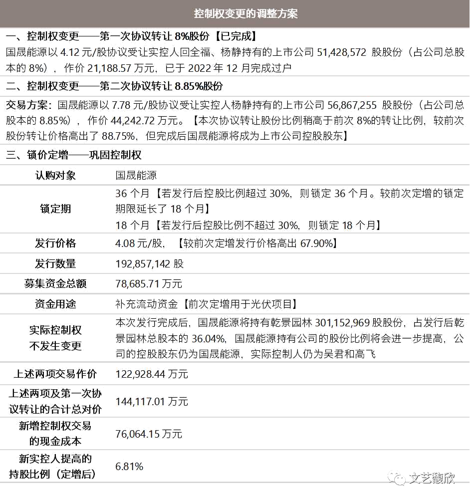 2023年8月9日晚,乾景园林公告了控制权交易的补充方案。在国晟能源已持有8%股份的基础上,其拟以二次协议受让上市公司8.85%股份的方式实现控制权变更,每股价格7.78元,交易作价为4.42亿元,对应上市公司交易市值为49.99亿元,较前次协议转让的交易市值高出88.75%。此次协议转让完成后,国晟能源将直接成为乾景园林的控股股东。同时,上市公司再次向国晟能源锁价定增,与前次定增的发行股数相同为1.93亿股,发行价格为4.08元/股,对应认购资金总价达到7.87亿元,较前次的4.69亿元增加了67.90%。较前次控制权交易方案,修改后的方案(包含第一次协议转让)对应上市公司整体交易市值为39.99亿元,较前次交易市值23.28亿元提高了71.76%;总交易对价增加了7.61亿元,增加的成本来源于二度协议转让8.85%股份对应的4.42亿元及定增发行价格由2.43元/股提高至4.08元/股致使定增总额增加了3.18亿元;新实控人因二度协议转让8.85%股份,在定增发行后其控股比例较前次提高了6.81%,控股比例的提升远不及收购成本的增加。以下为控制权变更的补充方案:
