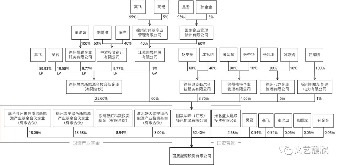 而本次乾景园林的收购主体国晟能源于2022年1月成立,本身无实际经营。且其股东结构穿透至最上层来看,自然人股东主要为国晟能源创始团队及关联方,除自然人以外主要股东的背景为各地国资,包括凤台县国资、淮北市国资、徐州市贾汪区国资。其中上述3大背景的国资产业基金均为私募股权投资基金,系在2022年10月增资入股,法人股东的设立时间也均较短。以下为其股权结构: